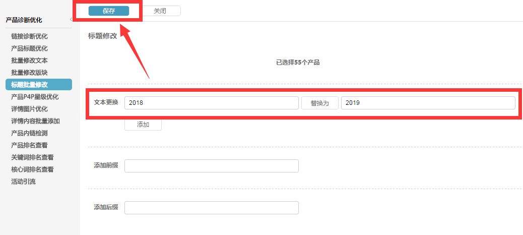 在倚天剑“产品诊断优化”-“标题批量修改”中,我们可以进行批量修改
